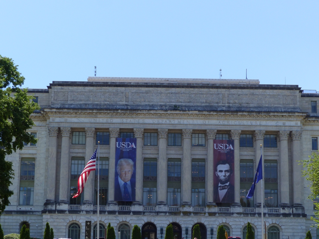 Descendant toujours le National Mall, nous voyons ensuite le département de l’agriculture avec une photo de Trump à côté de Lincoln, et nous arrivons au Washington Monument. Plus grand que celui de Baltimore, il mesure 152,4 m de haut surmonté d’un pyramidion de 16,8 m. Il a été construit en deux temps de 1848 à 1854 puis de 1877 à 1888 l’interruption étant due à un manque de sous.