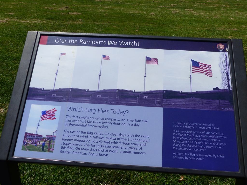 On vous a photograhié le panneau explicatif sur le drapeau américain qui flotte en permanence à l’entrée du fort. Sa taille dépend du vent, s’il pleut et s’il fait nuit. il faut dire que le plus grand ne peut être déployé qu’en l’absence de vent et necessite la présence de 16 soldats pour cette manoeuvre. Sa taille et son poids oblige d’ailleurs à ce qu’il soit roulé et non plié en triangle comme le veut la tradition.