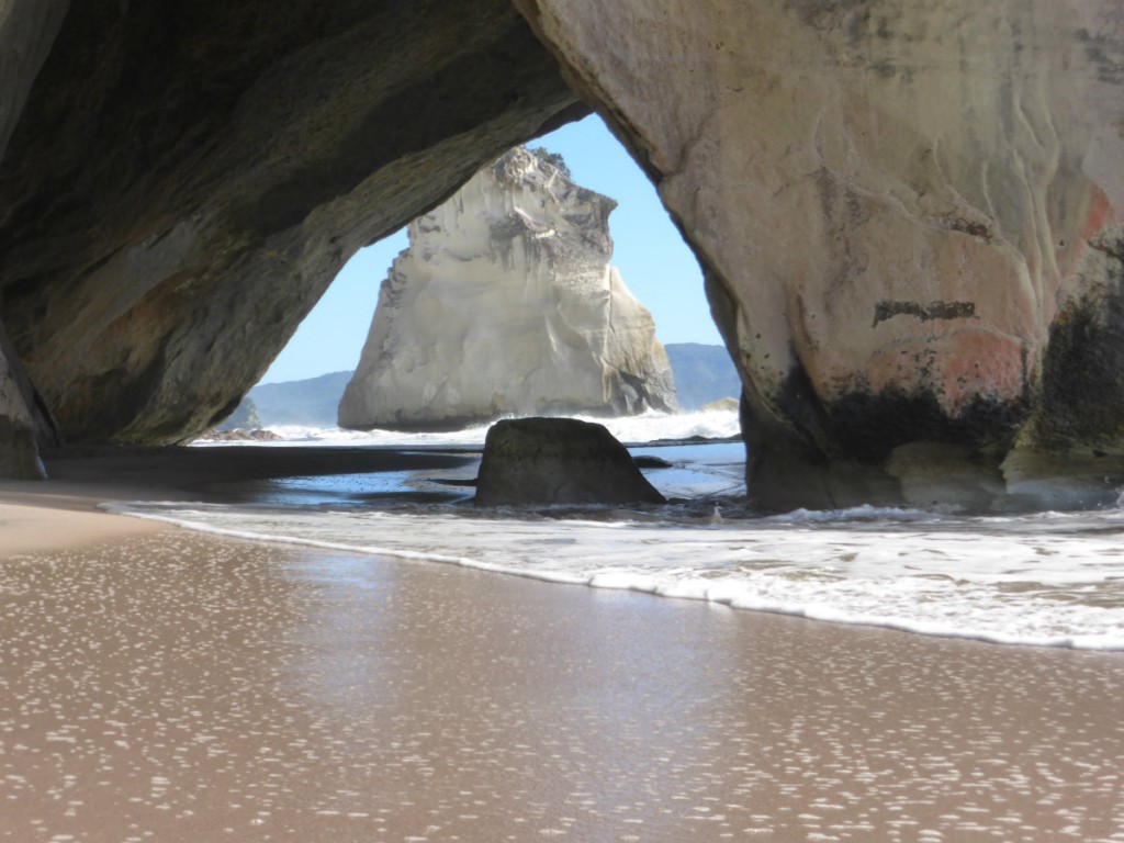 Le lendemain un trek de 2 heures tôt le matin et sous le soleil, au milieu des fougères arborescentes, nous a mené jusqu’à la plage de Cathédrale Cove.