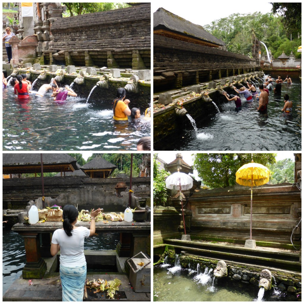Ici on se trouve sur un site d’eaux miraculeuses, un Lourdes local en fait. Beaucoup de temples et de bassins où coulent les eaux sacrées. Les pèlerins viennent déposer des offrandes sur les nombreux autels puis vont se baigner dans les différents bassins en mettant la tête sous les fontaines, en commençant par celle de gauche et en poursuivant vers la droite. Il faut respecter l’ordre pour bénéficier des pouvoirs de guérison et de survie de cette eau.