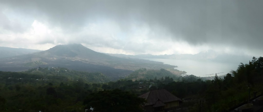 L’arrivée au lac Batur s’est faite, malheureusement, sous les nuages. Nous avons eu le temps d’apercevoir le Mont Batur avant qu’il ne disparaisse sous de gros nuages noirs mais nous ne pouvions pas nous approcher plus sous la pluie battante.