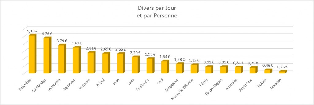 Par définition le poste divers n’est pas facile à définir. Le positionnement de la Polynésie s’explique par l’achat d’un nouvel appareil photo de remplacement, d’un ensemble masque-tuba et du rappel de vaccin contre l’hépatite B (et encore on n’a payé qu’une consultation pour deux ce qui nous a mis les deux vaccins à 94,13 € pour la team !). Les pays suivants sont tous les pays avec visa payant (souvent cher, le total des visas nous est revenu à 542 dollars américains) sauf l’Equateur qui est là à cause du droit d’entrée dans les îles Galápagos (220 dollars américains pour deux avec la taxe bagages comprise).