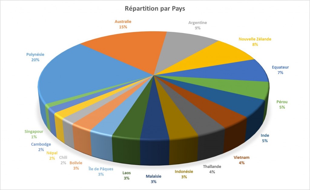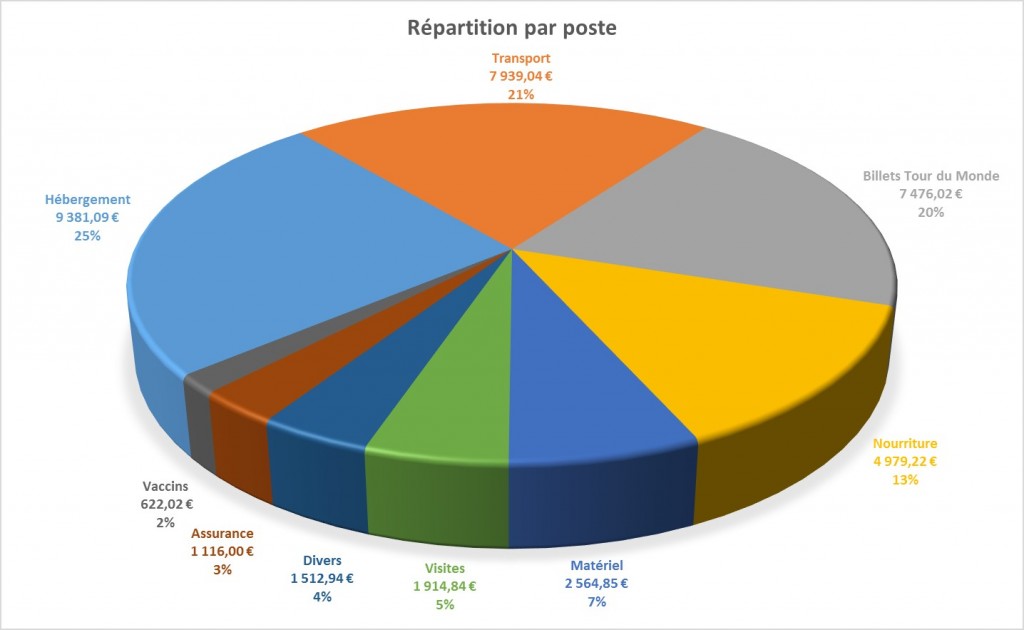 Quelques chiffres et camemberts pour clore ce blog en espérant qu’il vous aura fait voyager virtuellement et, pour ceux qui envisageraient un tour du monde, qu’il vous aura aidé dans vos préparatifs.