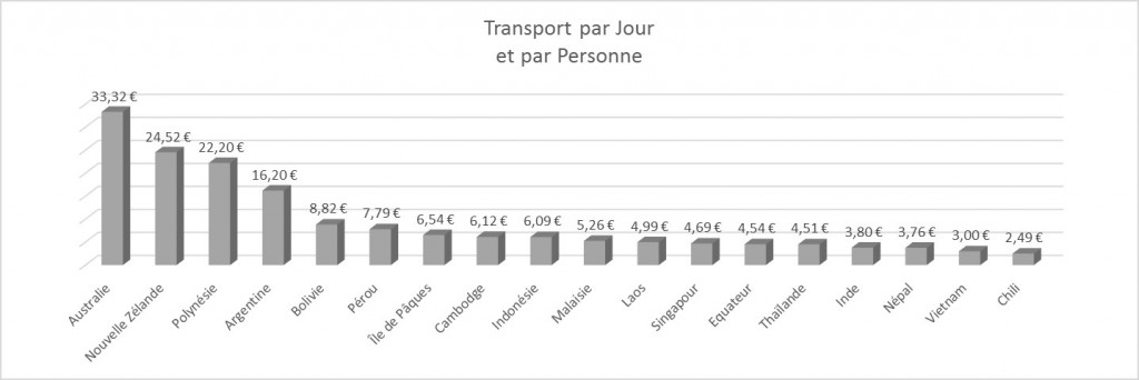 Sans surprise, l’Australie et la Nouvelle Zélande arrivent en tête du poste transport, ce qui est dû au choix du mode de transport individuel que nous avons fait et que nous ne regrettons absolument pas, celui de la camionnette-à-tout-faire ! Pas loin derrière, la Polynésie Française à cause du pass inter-îles Air-Tahiti, seul moyen de se déplacer d’île en île. Vient ensuite l’Argentine avec ses longs trajets en bus (très confortables) liés à la taille du pays. Le moins cher a été le Chili car nous n’y avons visité que Santiago et Valparaiso qui sont très proches l’une de l’autre. Le Vietnam est très bon marché grâce au système de “l’open bus ticket” qui permet de traverser tout le pays (avec les arrêts que l’on souhaite) pour un prix modique.