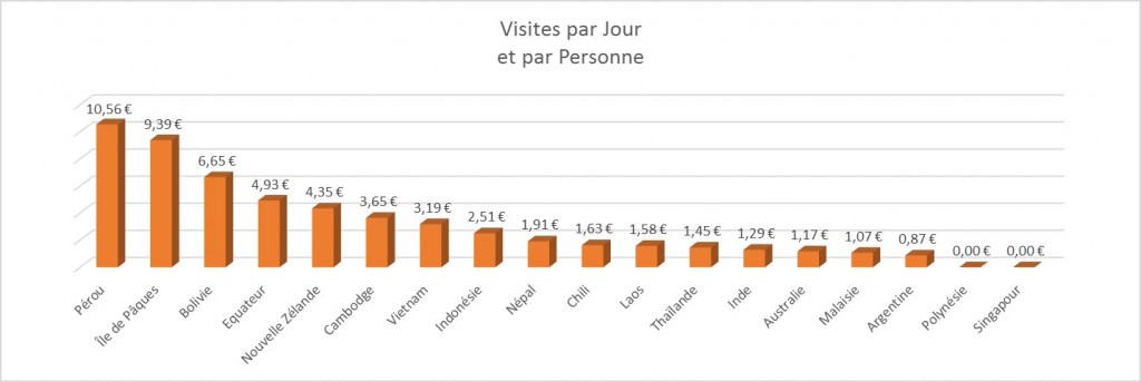 Beaucoup de choses à visiter au Pérou dont quelques unes en “tour” ce qui fausse un peu la donne car ces tours incluent du transport voire de l’hébergement quand ils se déroulent sur deux jours (c’est le cas pour le canyon de Colca ou le Machu Picchu). Pour comprendre les mystères de l’île de Pâques et ses légendes, il est très intéressant de prendre un guide pour la journée. Le notre était Angevin d’origine, et comme il avait vécu en Polynésie Française ils nous a donné de précieux conseils pour cette destination qui venait juste après dans le déroulé de notre voyage. Par contre comme notre séjour sur l’île n’était que de 9 jours, l’impact sur la moyenne journalière est très visible. De plus ce poste comprend le droit d’entrée sur le parc national (sur l’île en fait) qui est aussi cher que la visite guidée. A l’autre bout de l’échelle Singapour où nous avons juste flâné pendant 3 jours et la Polynésie où nous avons profité des activités gratuites proposées par nos hébergement (la présence ou non de ces activités en inclusion étant un facteur que nous prenions en compte lors du choix de ceux-ci).