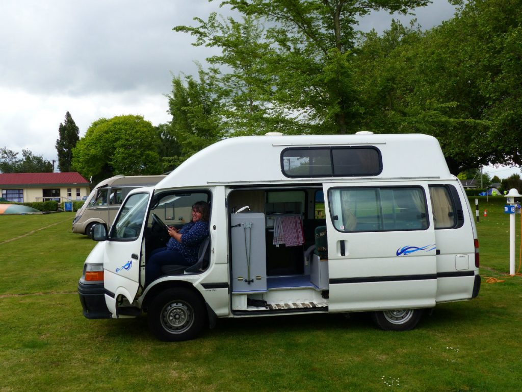 Notre valeureuse camionnette-à-tout-faire en version cuisine-salon-chambre-dressing au camping de Cambridge. Image qui peut devenir collector grâce à la présence du membre féminin de la Team Topette ! sur la photo.