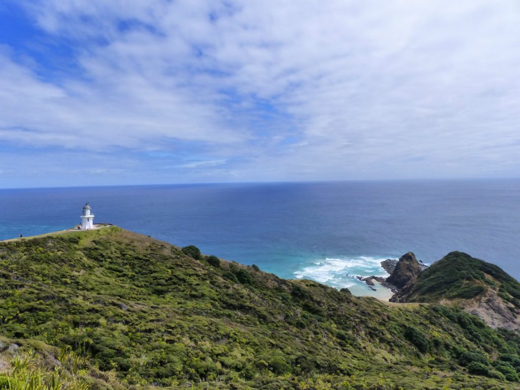 Le Cap Reinga est donc tout au bout de la pointe de l’île du Nord, à plus de 100 km au nord de la ville la plus proche. C’est là que se rencontrent la mer de Tasman et l’océan Pacifique.
