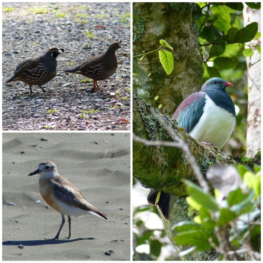 Le couple de Colin de Californie avec leur houppette, le Pluvier Roux et le gros pigeon appelé Kereru.