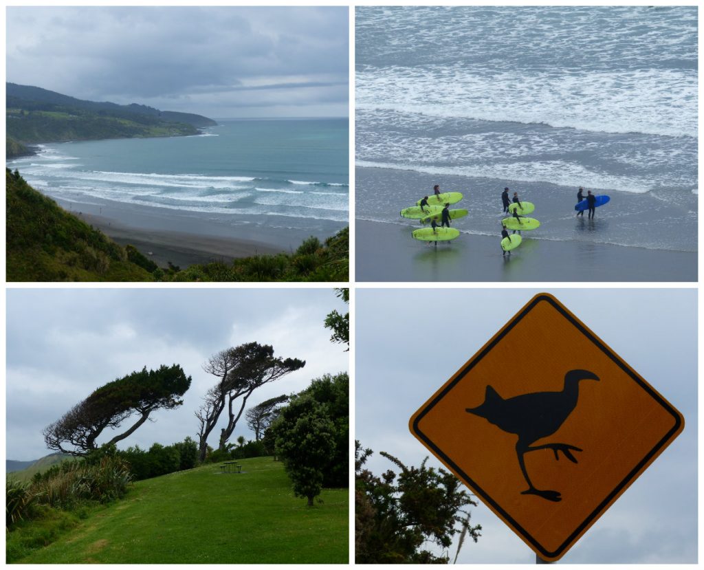 Tout est dans la photo : la mer de Tasman, des surfeurs, du vent et gaffe de ne pas écraser les pukekos !