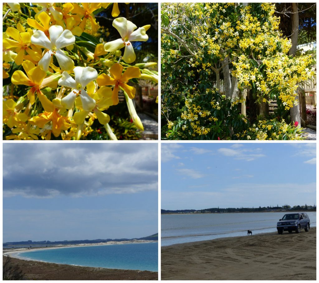 Il y a de belles fleurs à l’entrée du camping et une belle plage sur laquelle un néo-zélandais fainéant promène son chien en voiture.