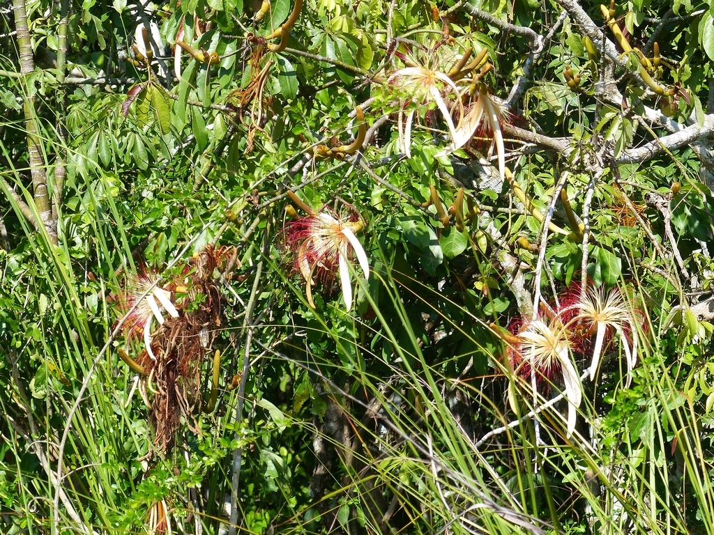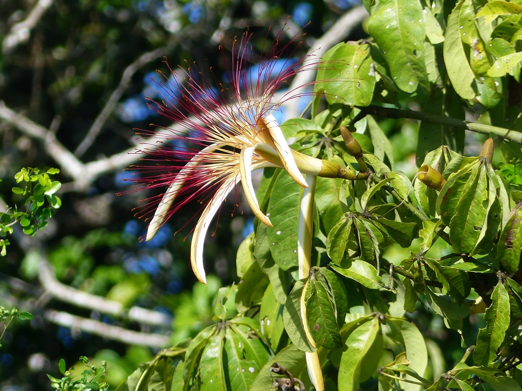 Et puis un Pachira aquatica (appelé aussi Châtaignier de Guyane) en fleur. Il produira un fruit oblong, en forme de ballon de football américain de 30 cm de long sur 13 cm de diamètre.