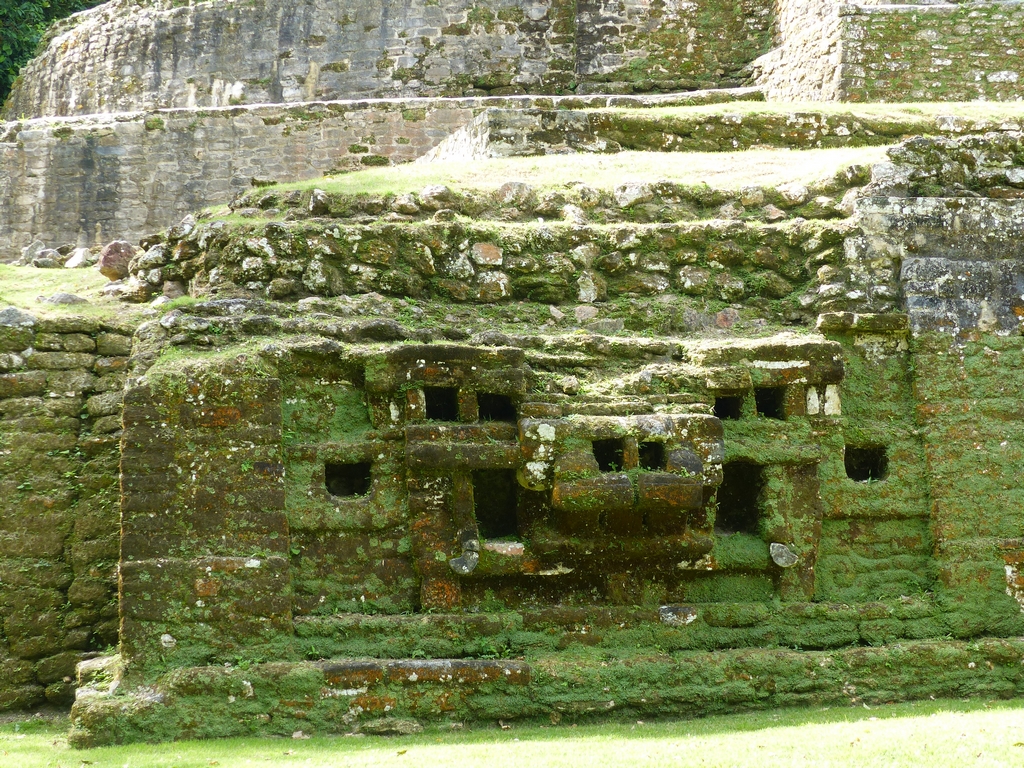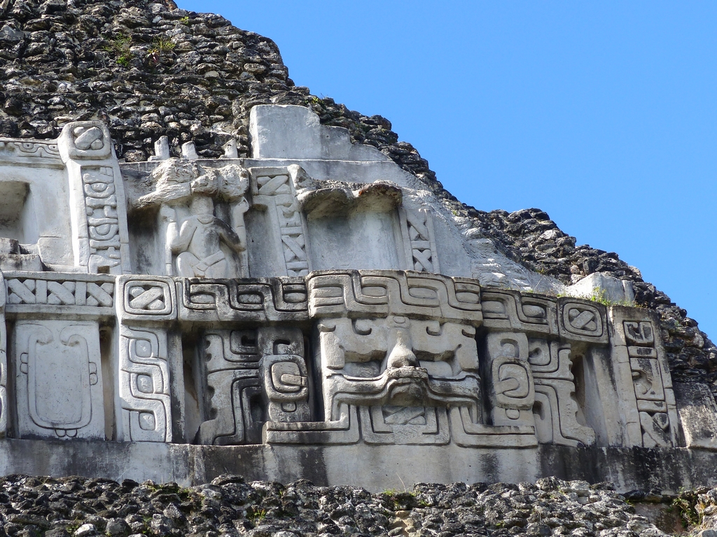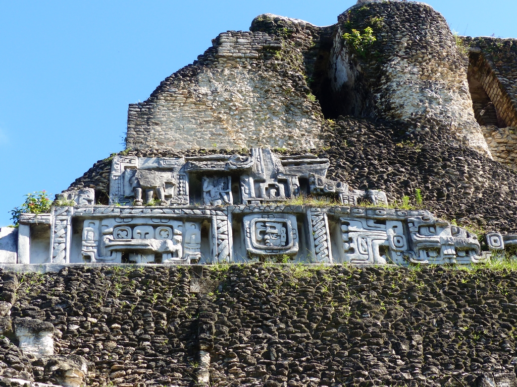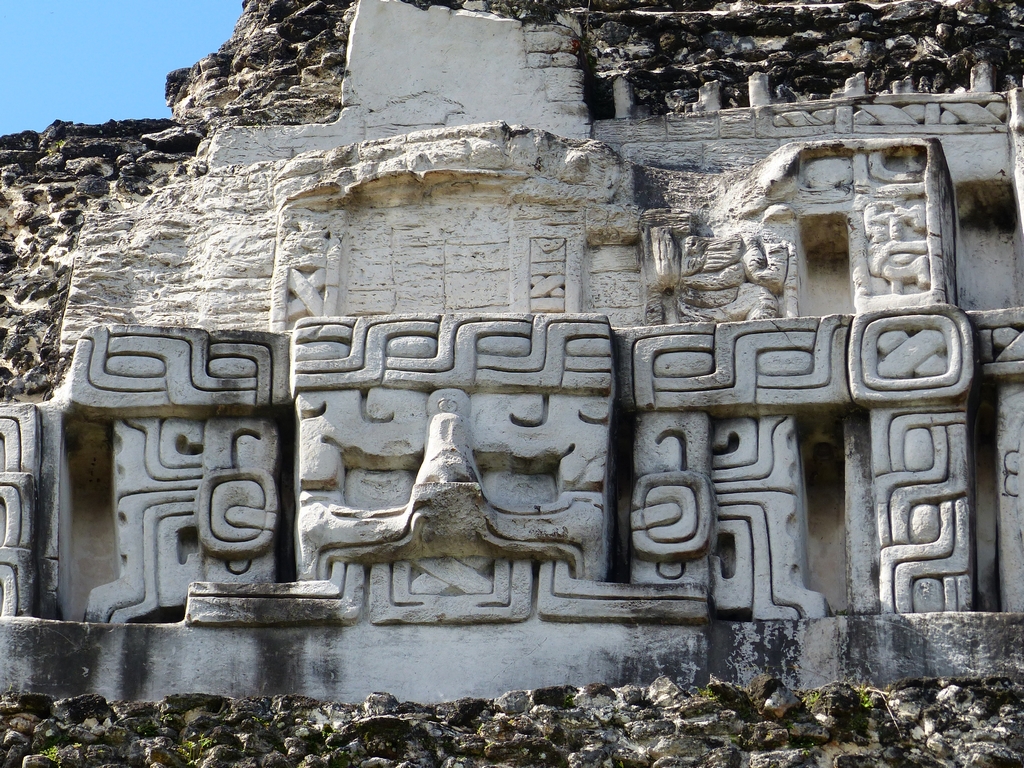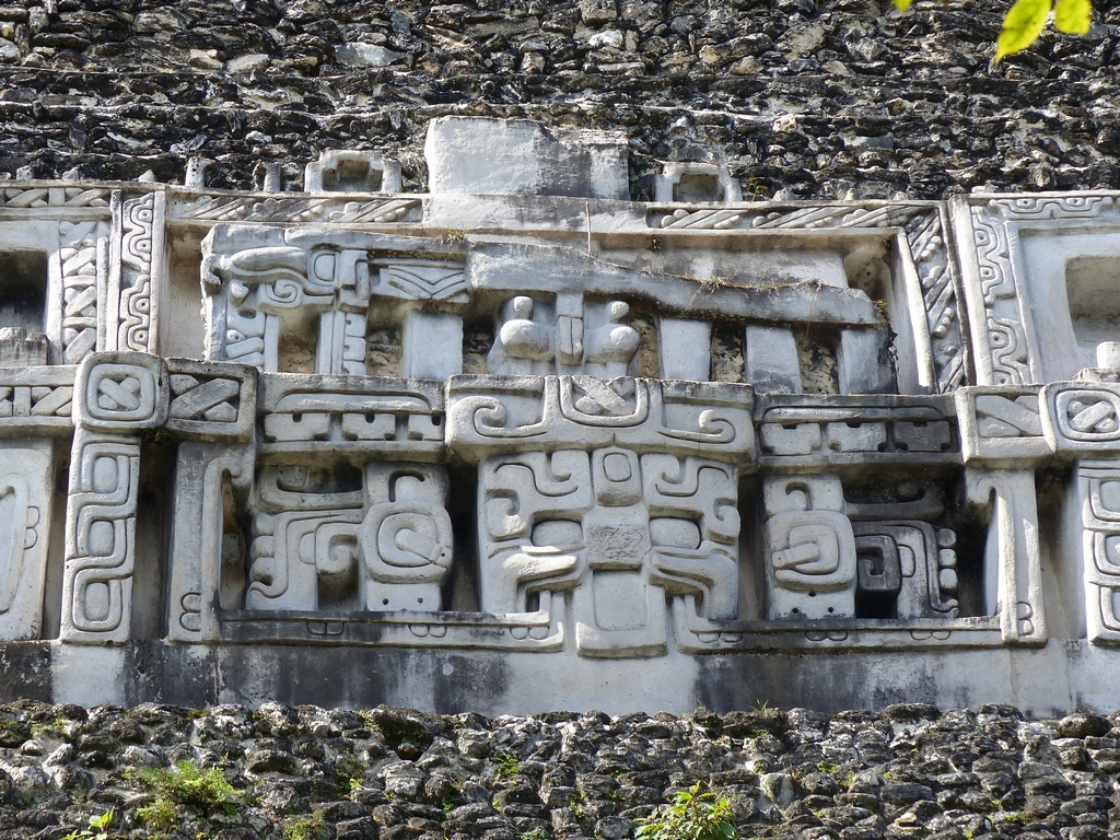 Sur ce site aussi, il est encore possible de monter sur les pyramides, ce qui permet d’apprécier au plus près, sur ses deux faces, plusieurs frises de stuc, ponctuées de grands masques. Il s’agit de copies recouvrant les originaux pour les protéger.