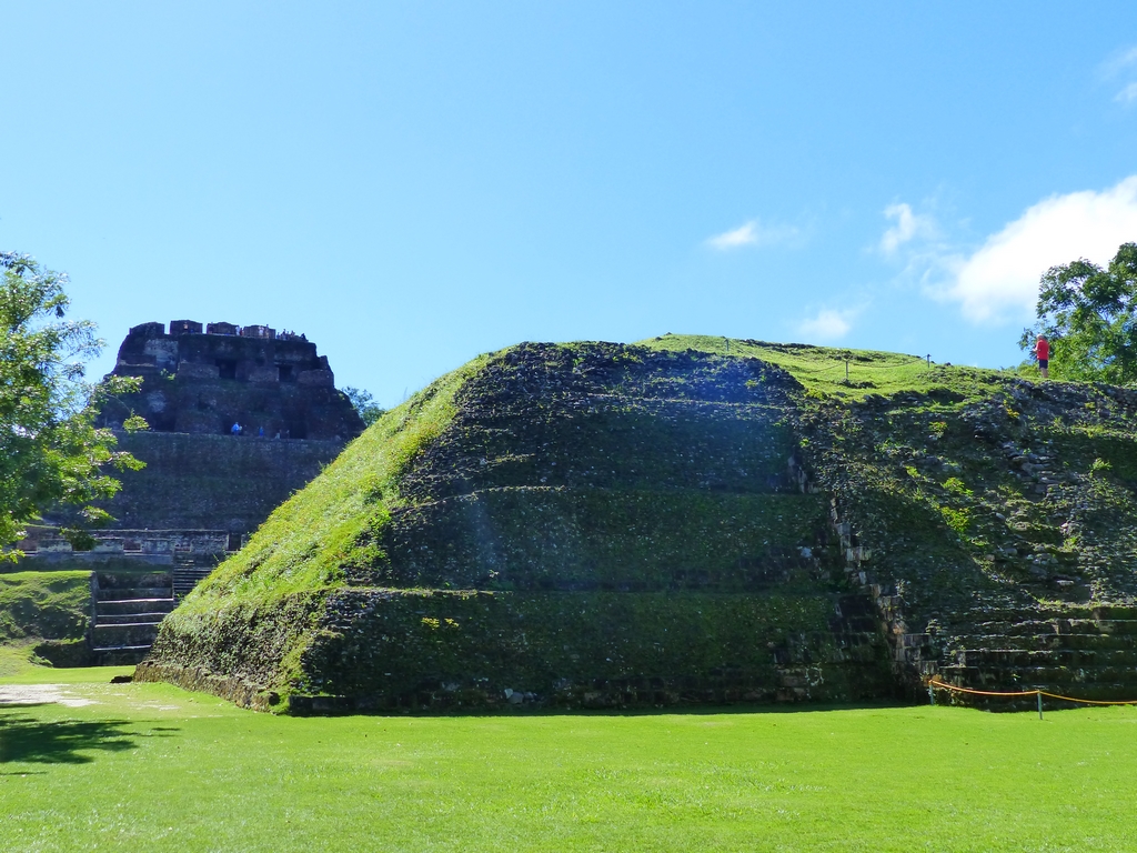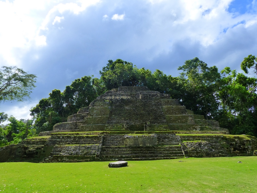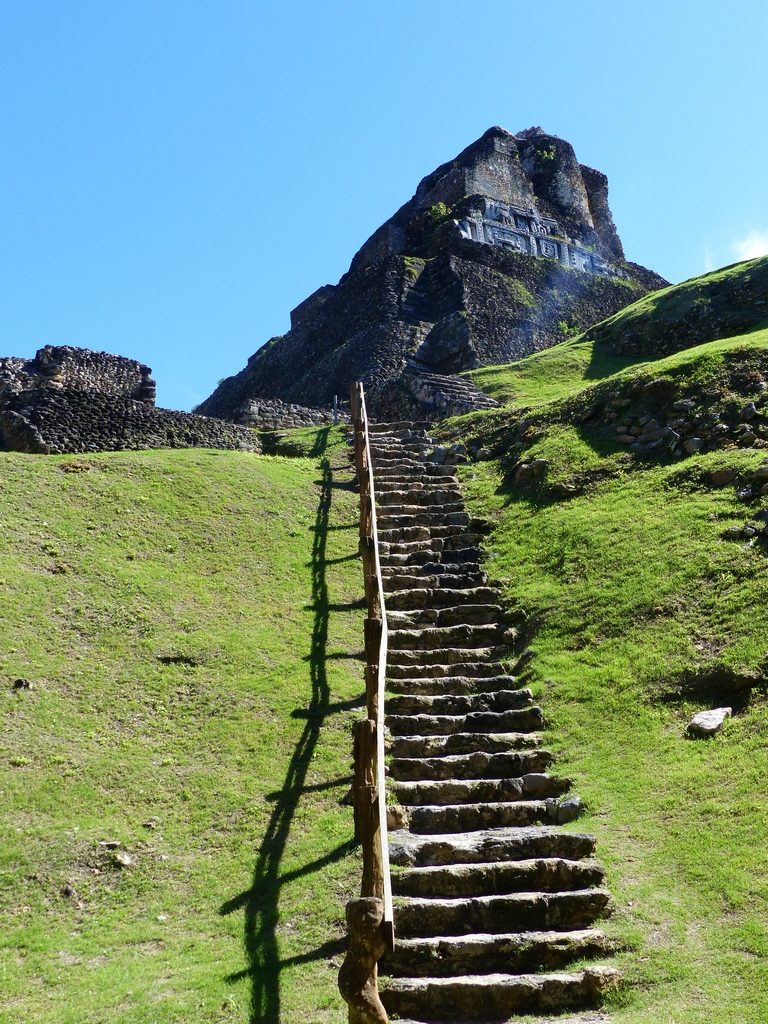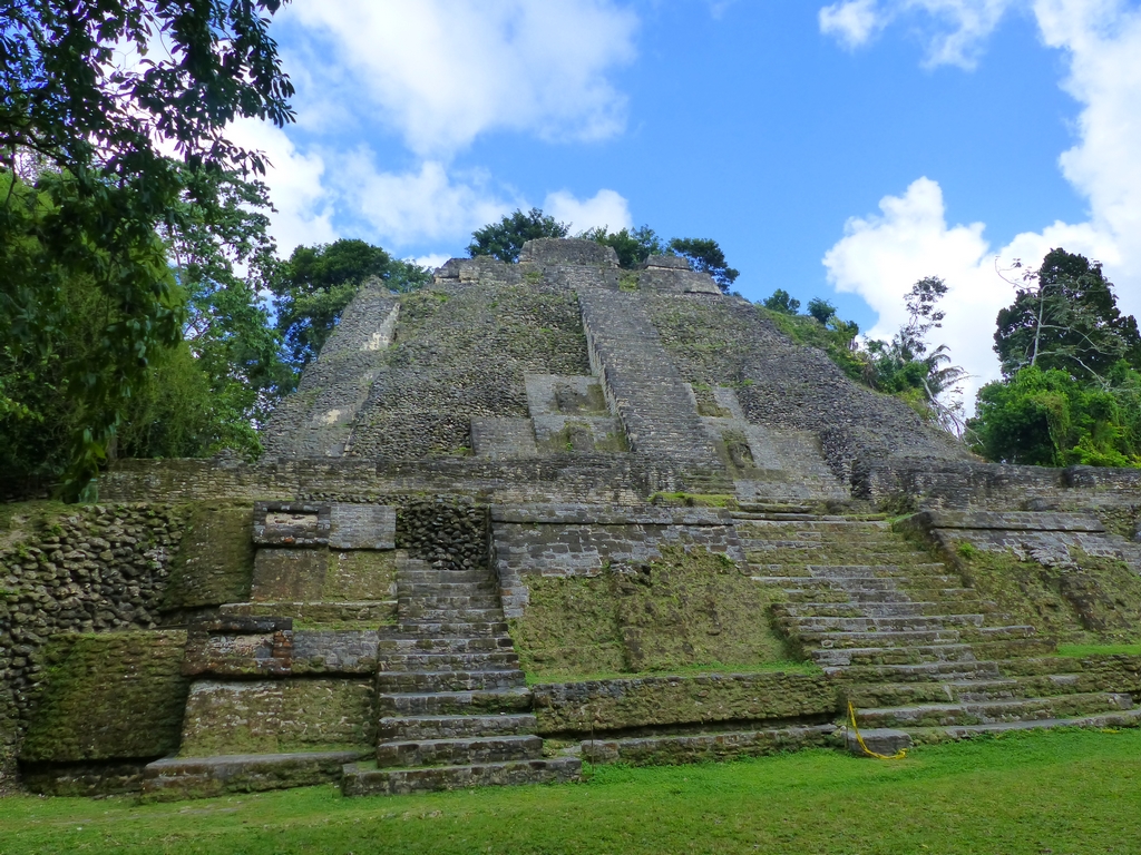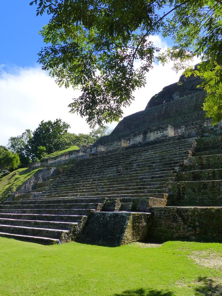 Nous débarquons enfin à Lamanai (crocodile sous l’eau en langue Maya), site archéologique, Maya donc, occupé pendant plus de 3 000 ans, jusqu’au contact européen. La première pyramide appelée le Haut Temple fait 33 mètres de haut (d’où son nom, malin non ?).