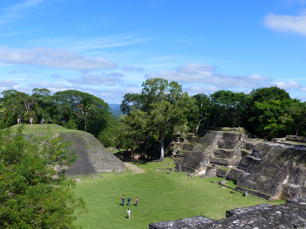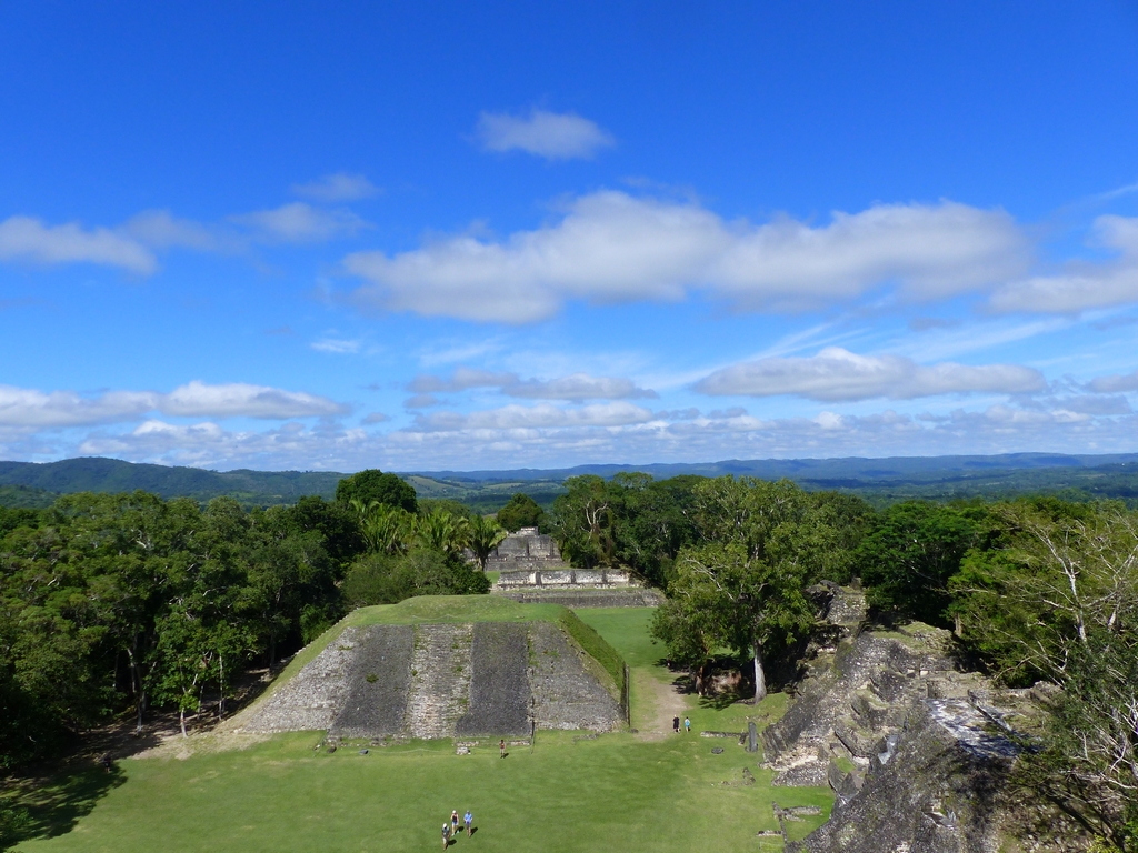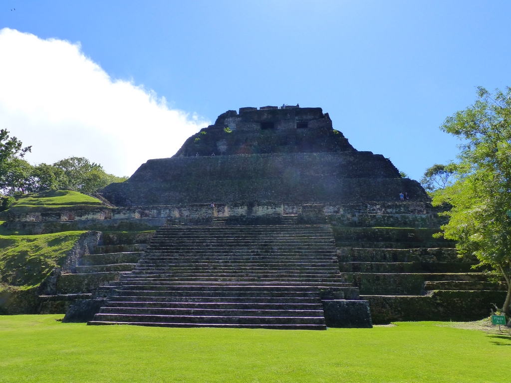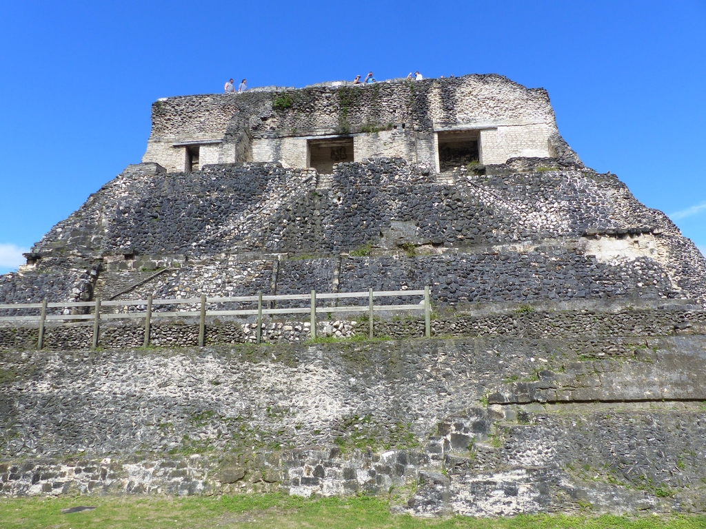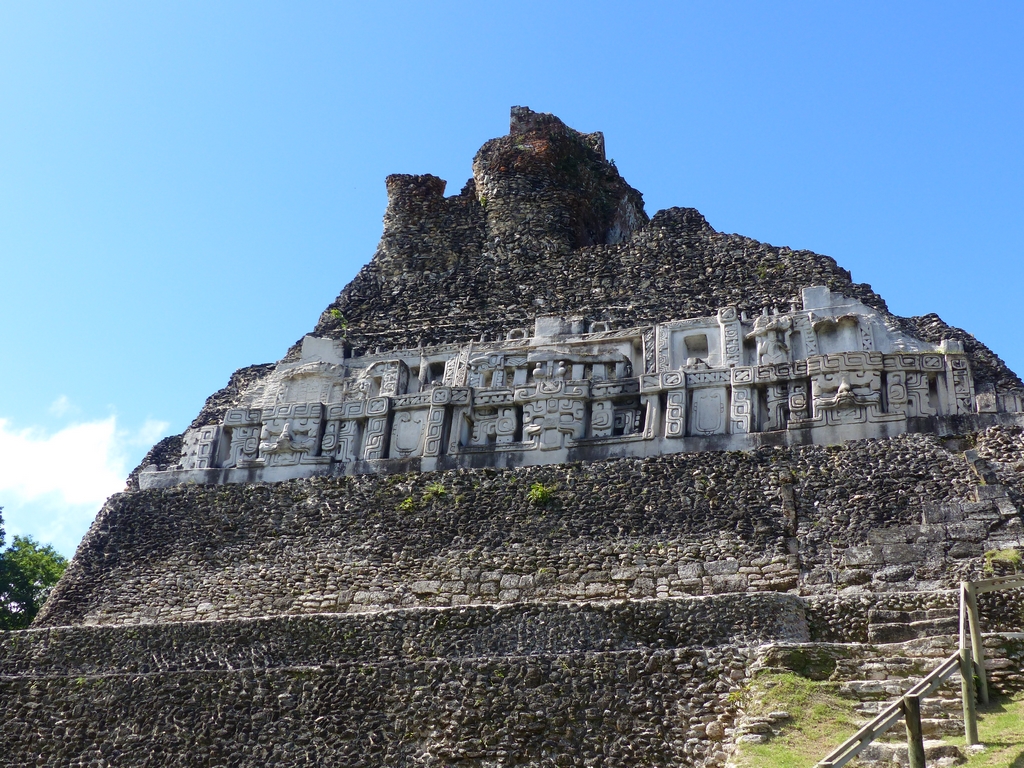 Nous débarquons enfin à Lamanai (crocodile sous l’eau en langue Maya), site archéologique, Maya donc, occupé pendant plus de 3 000 ans, jusqu’au contact européen. La première pyramide appelée le Haut Temple fait 33 mètres de haut (d’où son nom, malin non ?).