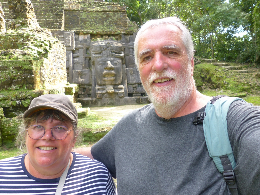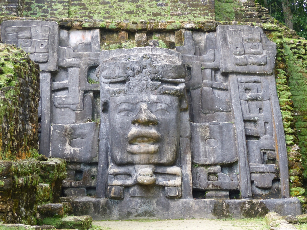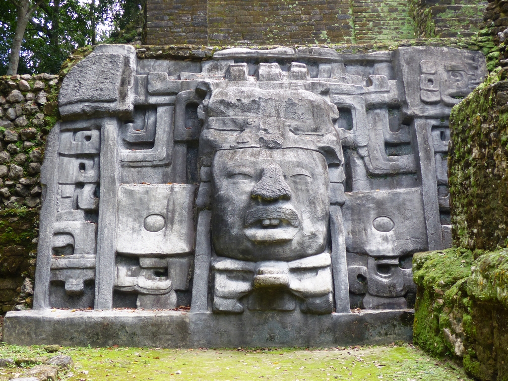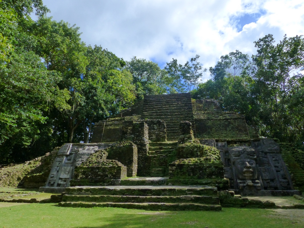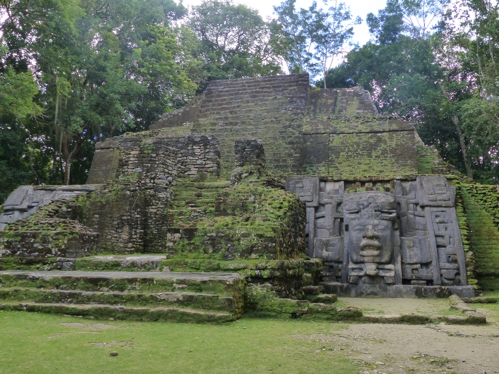 Lamanai se différencie des autres sites archéologiques grâce au masque d’un souverain maya émergeant d’une coiffe de crocodile. C’est rigolo ça nous a fait penser au Bayon, le temple le plus connu d’Angkor Thom au Cambodge avec ses têtes de bouddhas.
