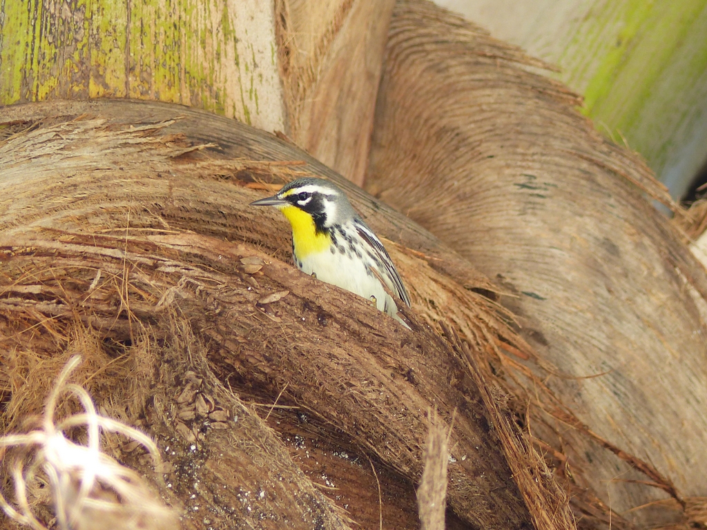 On pourrait croire comme ça que nous sommes en train de glander, mais que nenni, on est en train de guetter une charmante Paruline à gorge jaune en haut du cocotier où est accroché un hamac.