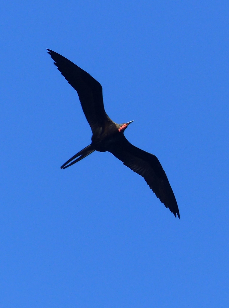 Comme vous commencez sans doute à le savoir, notre truc c’est les oiseaux (ceux qui ne savaient pas, maintenant c’est fait). On a donc levé le nez pour voir des Frégates Superbes, déjà vues aux Galapagos (le mâle gonfle son jabot rouge pour attirer les femelles), qui volaient en bande.