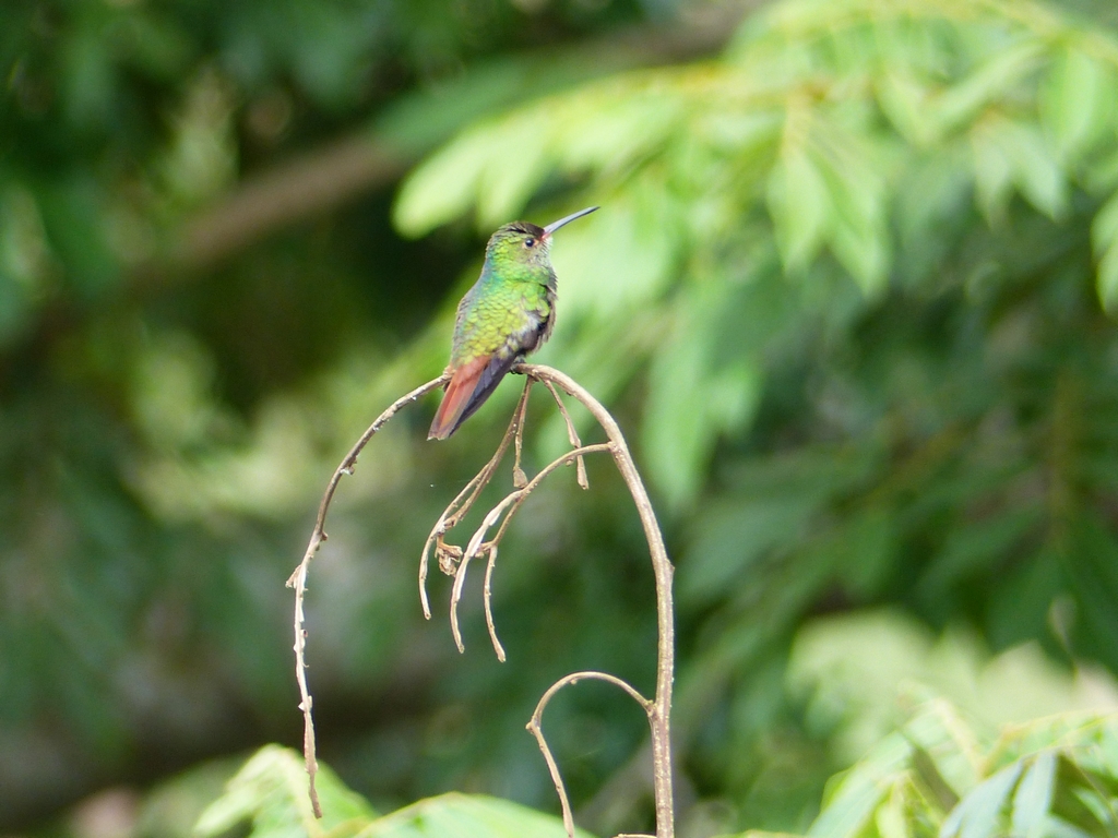 Bon San Ignacio, on ne vous le cachera pas, c’est pas vraiment le lieu rêvé pour les vacances. Mais il y a une rivière en bas du village et bien sûr qui dit rivière dit oiseaux. Alors on a vu un Héron Vert et grâce à l’œil aiguisé de Martine qui l’a repéré dans un arbre, un Colibri (le graal du photographe amoureux des oiseaux, car très difficile à photographier).