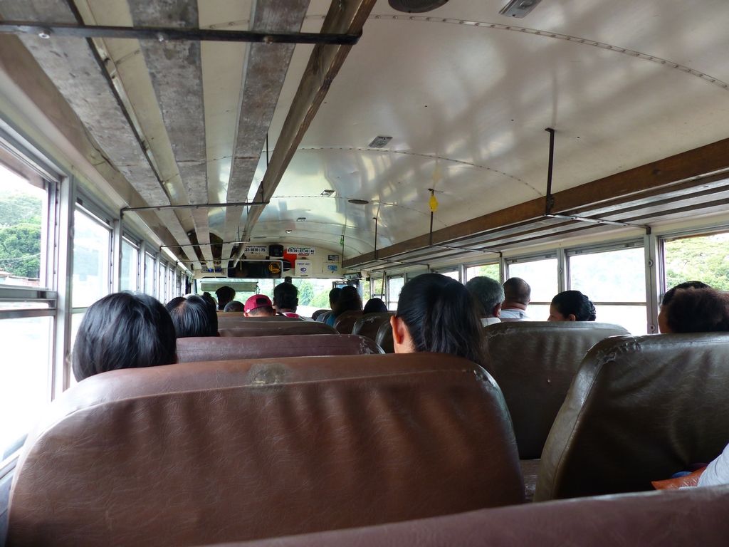 Pendant que je faisais la queue, Martine a négocié deux places dans un bus qui allait à Belize City pour deux fois et demi moins cher que ce que demandaient les chauffeurs de taxi (on pense que le patron du chauffeur de bus n’en saura jamais rien).