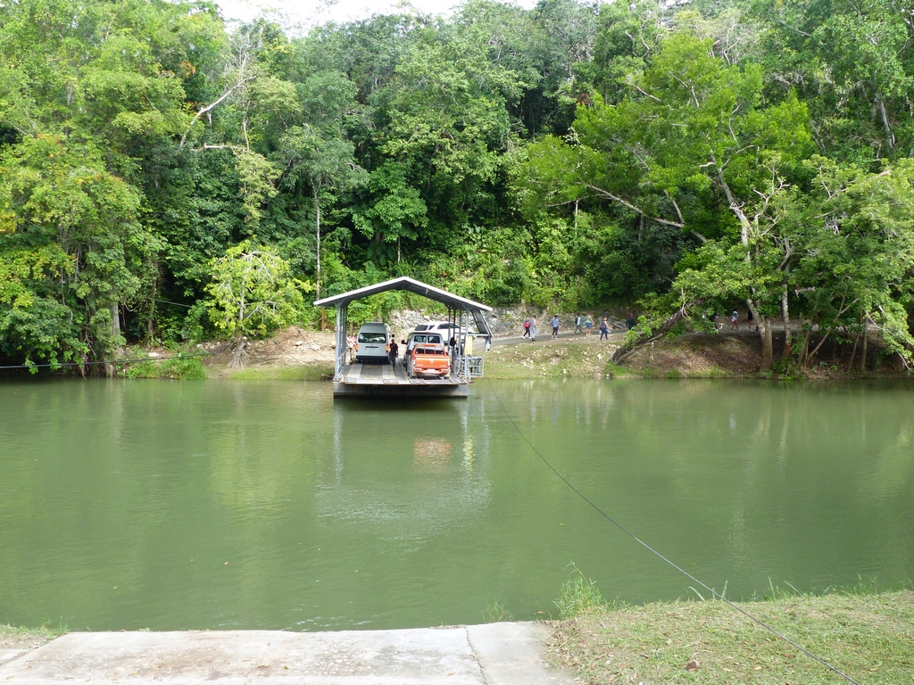 Mais si on vient à San Ignacio, en fait c’est pour aller au site archéologique de Xunantunich. Pour y aller on commence par attendre le bus une heure, puis après une demi-heure de route on descend pour prendre un bac à câble (comme celui de l’île St Aubin à Angers) et puis on marche 2 kms (en montée, sinon c’est pas drôle) et on arrive sur le site.